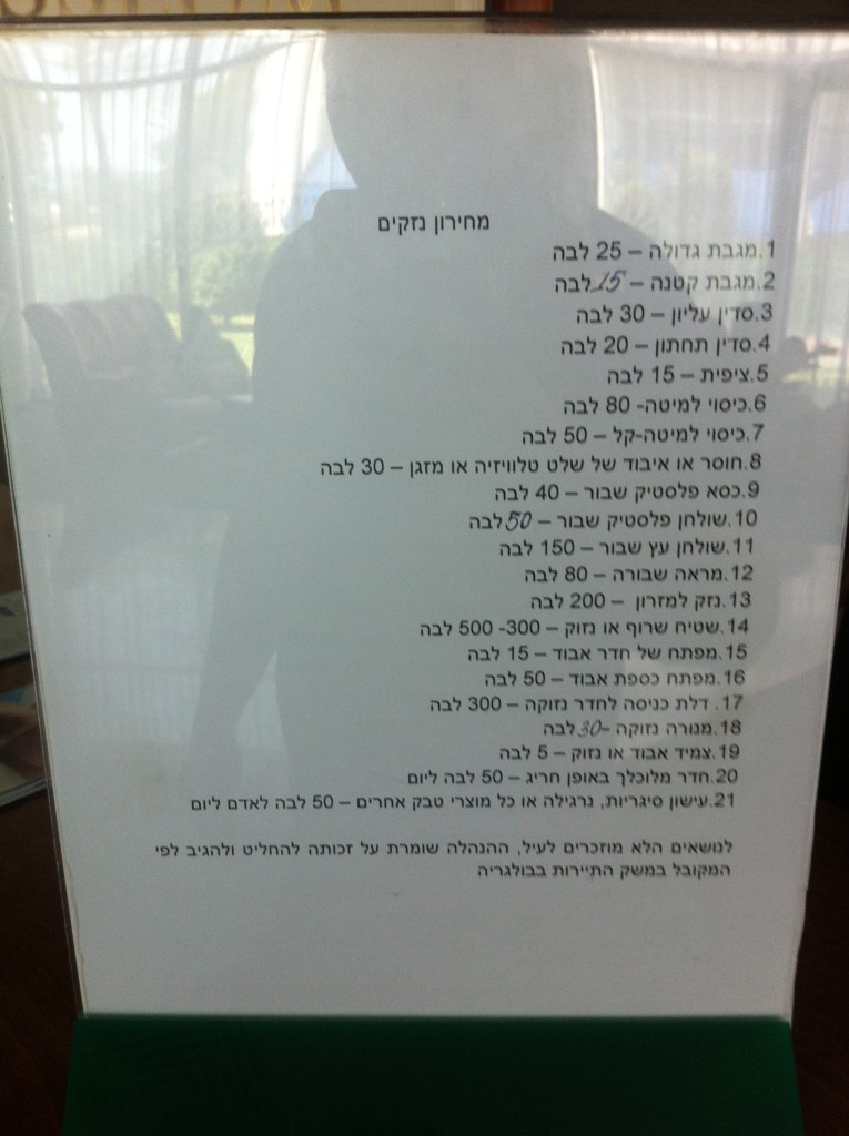 ממליץ להסתכל על תמונת מחירון הנזקים של אחד מהמלונות המועדפים על הצעירים אשר מגיעים מישראל.